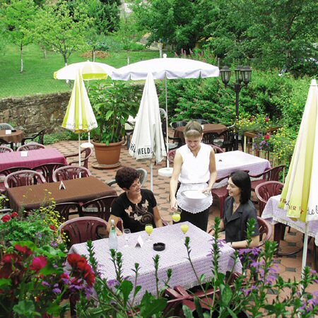 unserer ruhig gelegenen Terrasse speisen und verweilen.